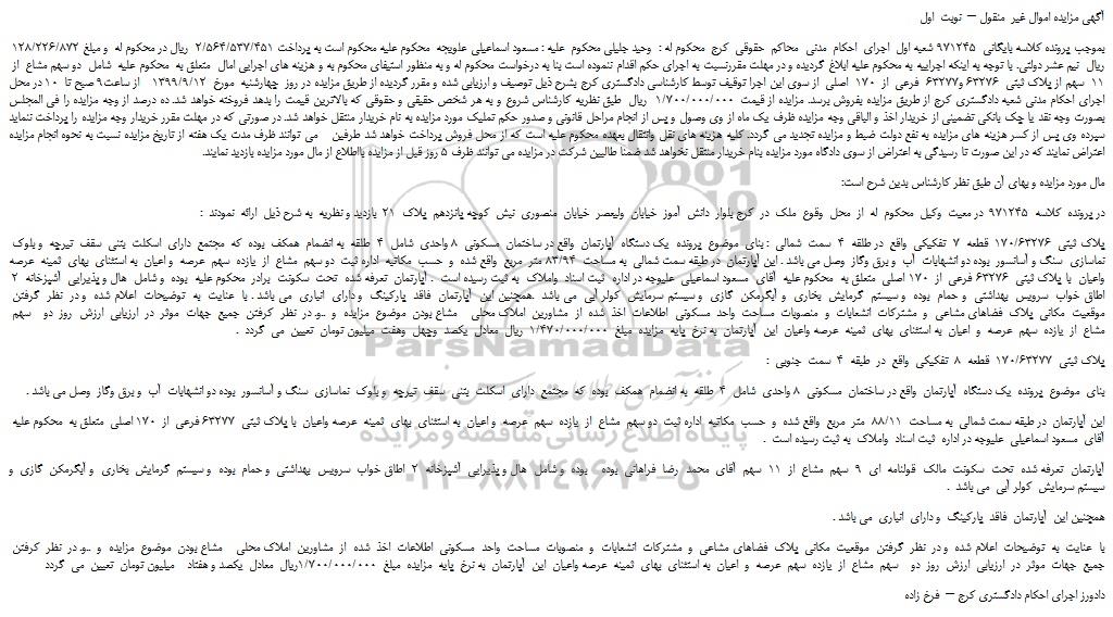 بموجب پرونده کلاسه بایگانی  971245 شعبه اول  اجرای  احکام  مدنی  محاکم  حقوقی  کرج  محکوم له :  وحید جلیلی محکوم  علیه : مسعود اسماعیلی علویجه  محکوم علیه محکوم است به پرداخت 2/564/537/451  ریال در محکوم له  و مبلغ 128/226/872  ریال  نیم عشر دولتی. با توجه به اینکه اجراییه به محکوم علیه ابلاغ گردیده و در مهلت مقررنسبت به اجرای حکم اقدام ننموده است بنا به درخواست محکوم له و به منظور استیفای محکوم به و هزینه های اجرایی امال  متعلق به  محکوم علیه  شامل  دو سهم مشاع  از  11  سهم از پلاک ثبتی  63276 و63277  فرعی  از  170  اصلی  از سوی این اجرا توقیف توسط کارشناسی دادگستری کرج بشرح ذیل توصیف و ارزیابی شده و مقرر گردیده از طریق مزایده در روز  چهارشنبه  مورخ  1399/9/12    از ساعت9 صبح تا  10 در محل اجرای احکام مدنی شعبه دادگستری کرج از طریق مزایده بفروش برسد. مزایده از قیمت  1/700/000/000  ریال  طبق نظریه کارشناس شروع و به هر شخص حقیقی و حقوقی که بالاترین قیمت را بدهد فروخته خواهد شد. ده درصد از وجه مزایده را فی المجلس بصورت وجه نقد یا چک بانکی تضمینی از خریدار اخذ و الباقی وجه مزایده ظرف یک ماه از وی وصول و پس از انجام مراحل قانونی و صدور حکم تملیک مورد مزایده به نام خریدار منتقل خواهد شد. در صورتی که در مهلت مقرر خریدار وجه مزایده را پرداخت ننماید سپرده وی پس از کسر هزینه های مزایده به نفع دولت ضبط و مزایده تجدید می گردد. کلیه هزینه های نقل وانتقال بعهده محکوم علیه است که از محل فروش پرداخت خواهد شد طرفین    می توانند ظرف مدت یک هفته از تاریخ مزایده نسبت به نحوه انجام مزایده اعتراض نمایند که در این صورت تا رسیدگی به اعتراض از سوی دادگاه مورد مزایده بنام خریدار منتقل نخواهد شد ضمنا طالبین شرکت در مزایده می توانند ظرف 5 روز قبل از مزایده بااطلاع از مال مورد مزایده بازدید نمایند.