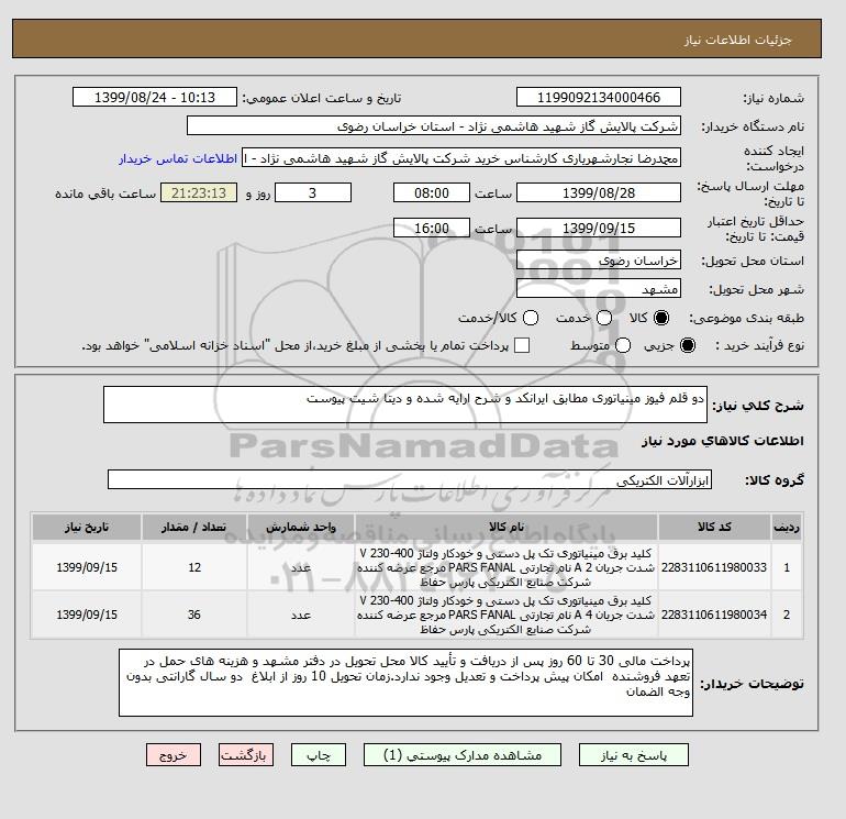 نام دستگاه خریدار:شرکت پالایش گاز شهید هاشمی نژاد - استان خراسان رضوی