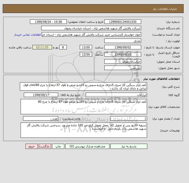نام دستگاه خریدار:شرکت پالایش گاز شهید هاشمی نژاد - استان خراسان رضوی
