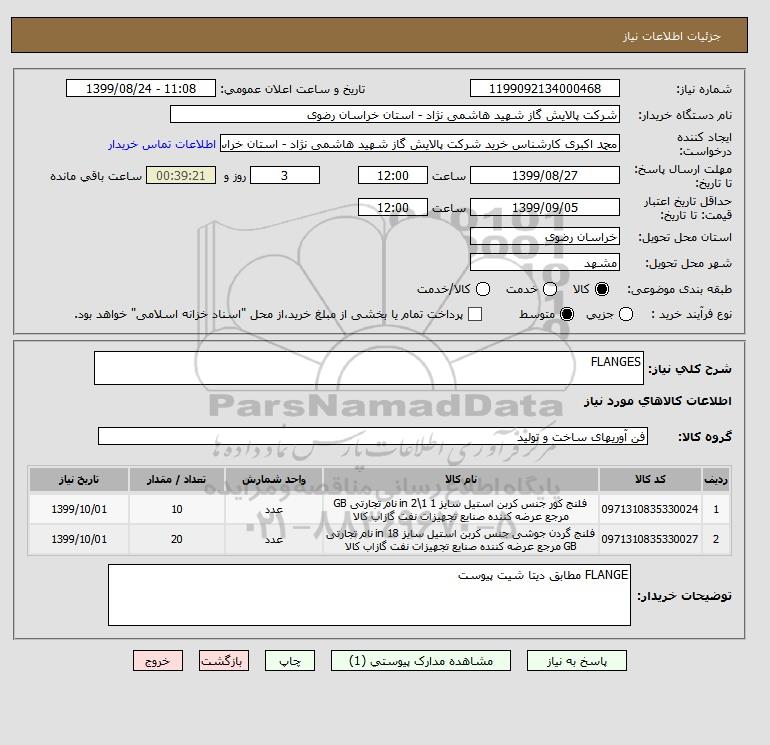 نام دستگاه خریدار:شرکت پالایش گاز شهید هاشمی نژاد - استان خراسان رضوی