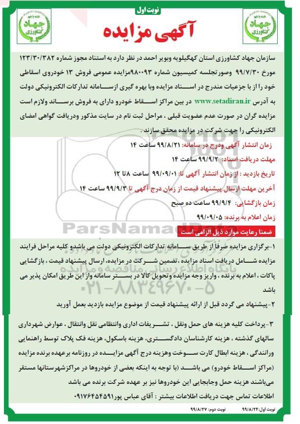 سازمان جهاد کشاورزی استان کهگیلویه و بویر احمد در نظر دارد مزایده عمومی فروش  13 خودروی اسقاطی خود را از با جزعیات مندرج در اسناد مزایده و با بهره گیری از س امانه تدارکات الکترونیکی دولت به آدرس ستاد ایران  در بین مراکز اسقاط خودرو دارای به فروش برساند و لازم است مزایده گران در صورت عدم عضویت قبلی ، مراحل ثبت نام در سایت مذکور و دریافت گواهی امضای الکترونیکی را جهت شرکت در مزایده محقق سازند.