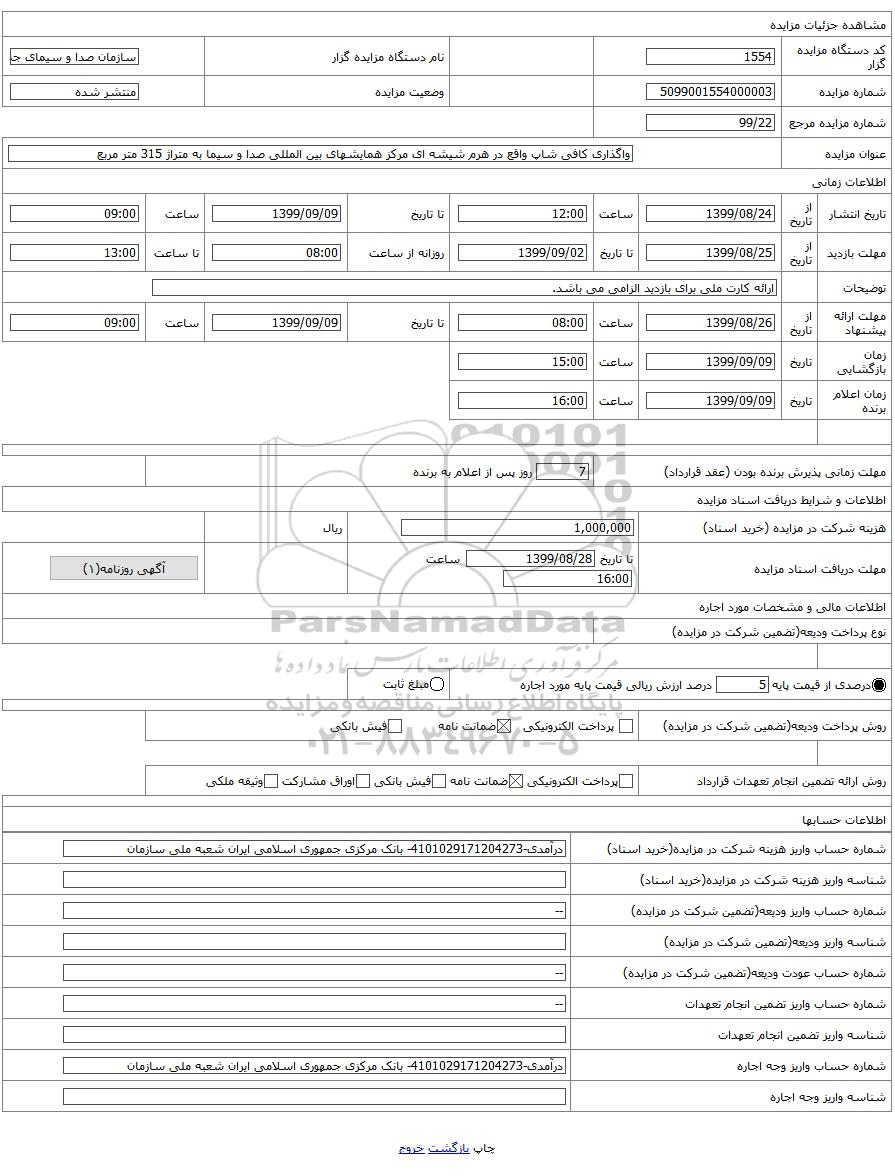 | عنوان مزایده | واگذاری کافی شاپ واقع در هرم شیشه ای مرکز همایشهای بین المللی صدا و سیما به متراژ 315 متر مربع | |||