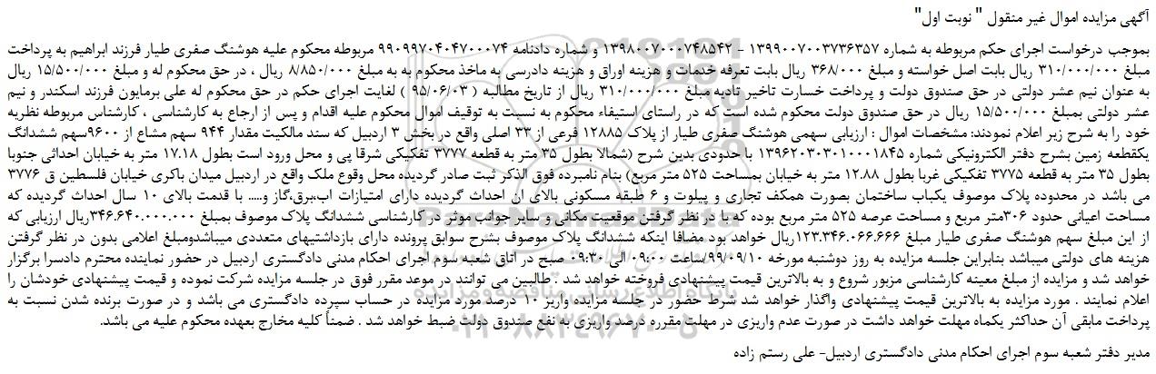 بموجب درخواست اجرای حکم مربوطه به شماره 1399007003736357 - 1398007000748542 و شماره دادنامه 9909970404700074 مربوطه محکوم علیه هوشنگ صفری طیار فرزند ابراهیم به پرداخت مبلغ 310/000/000 ریال بابت اصل خواسته و مبلغ 368/000 ریال بابت تعرفه خدمات و هزینه اوراق و هزینه دادرسی به ماخذ محکوم به به مبلغ 8/850/000 ریال ، در حق محکوم له و مبلغ 15/500/000 ریال به عنوان نیم عشر دولتی در حق صندوق دولت و پرداخت خسارت تاخیر تادیه مبلغ 310/000/000 ریال از تاریخ مطالبه ( 95/06/03 ) لغایت اجرای حکم در حق محکوم له علی برمایون فرزند اسکندر و نیم عشر دولتی بمبلغ 15/500/000 ریال در حق صندوق دولت محکوم شده است که در راستای استیفاء محکوم به نسبت به توقیف اموال محکوم علیه اقدام و پس از ارجاع به کارشناسی ، کارشناس مربوطه نظریه خود را به شرح زیر اعلام نمودند: مشخصات اموال : ارزیابی سهمی هوشنگ صفری طیار از پلاک 12885 فرعی از 33 اصلی واقع در بخش 3 اردبیل که سند مالکیت مقدار 944 سهم مشاع از 9600سهم ششدانگ یکقطعه زمین بشرح دفتر الکترونیکی شماره 139620303010001845 با حدودی بدین شرح (شمالا بطول 35 متر به قطعه 3777 تفکیکی شرقا پی و محل ورود است بطول 17.18 متر به خیابان احداثی جنوبا بطول 35 متر به قطعه 3775 تفکیکی غربا بطول 12.88 متر به خیابان بمساحت 525 متر مربع) بنام نامبرده فوق الذکر ثبت صادر گردیده محل وقوع ملک واقع در اردبیل میدان باکری خیابان فلسطین ق 3776 می باشد در محدوده پلاک موصوف یکباب ساختمان بصورت همکف تجاری و پیلوت و 6 طبقه مسکونی بالای ان احداث گردیده دارای امتیازات اب،برق،گاز و..... با قدمت بالای 10 سال احداث گردیده که مساحت اعیانی حدود 306متر مربع و مساحت عرصه 525 متر مربع بوده که با در نظر گرفتن موقعیت مکانی و سایر جوانب موثر در کارشناسی ششدانگ پلاک موصوف بمبلغ 346.640.000.000ریال ارزیابی که از این مبلغ سهم هوشنگ صفری طیار مبلغ 123.346.066.666ریال خواهد بود مضافا اینکه ششدانگ پلاک موصوف بشرح سوابق پرونده دارای بازداشتیهای متعددی میباشدومبلغ اعلامی بدون در نظر گرفتن هزینه های دولتی میباشد بنابراین جلسه مزایده به روز دوشنبه مورخه 99/09/10/ساعت 09:00 الی 09:30 صبح در اتاق شعبه سوم اجرای احکام مدنی دادگستری اردبیل در حضور نماینده محترم دادسرا برگزار خواهد شد و مزایده از مبلغ معینه کارشناسی مزبور شروع و به بالاترین قیمت پیشنهادی فروخته خواهد شد . طالبین می توانند در موعد مقرر فوق در جلسه مزایده شرکت نموده و قیمت پیشنهادی خودشان را اعلام نمایند . مورد مزایده به بالاترین قیمت پیشنهادی واگذار خواهد شد شرط حضور در جلسه مزایده واریز 10 درصد مورد مزایده در حساب سپرده دادگستری می باشد و در صورت برنده شدن نسبت به پرداخت مابقی آن حداکثر یکماه مهلت خواهد داشت در صورت عدم واریزی در مهلت مقرره درصد واریزی به نفع صندوق دولت ضبط خواهد شد . ضمناً کلیه مخارج بعهده محکوم علیه می باشد.