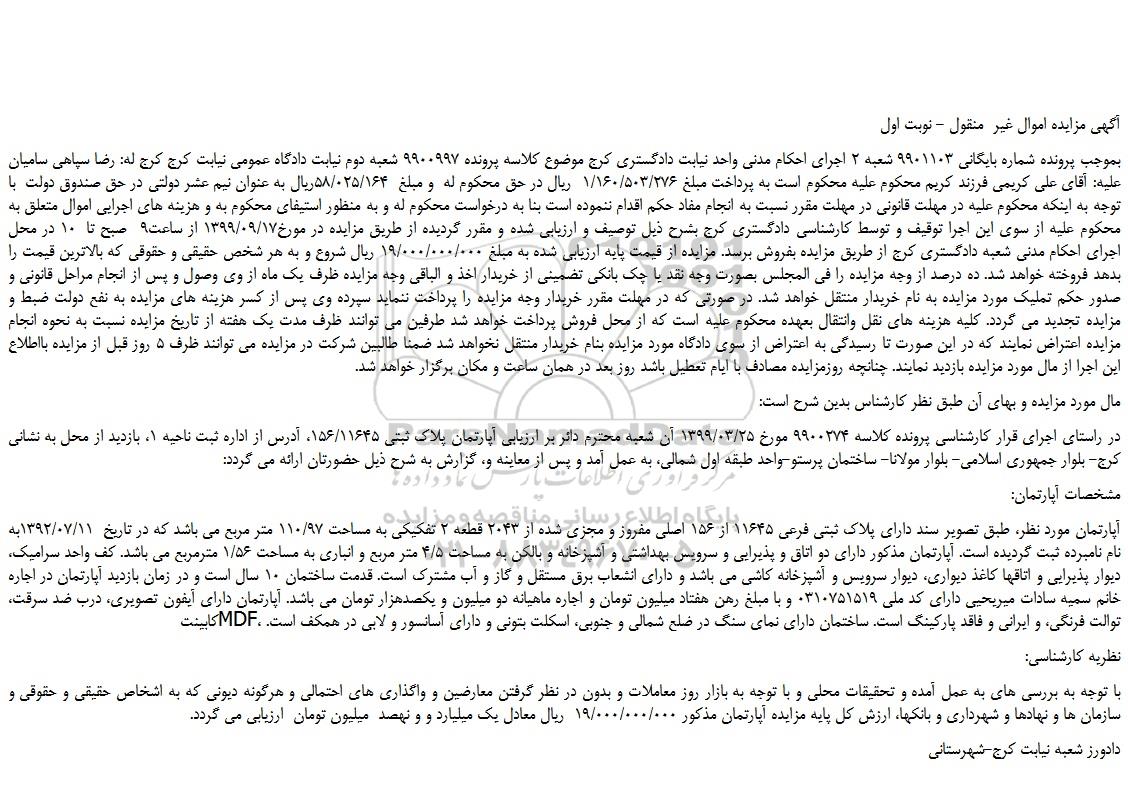بموجب پرونده شماره بایگانی 9901103 شعبه 2 اجرای احکام مدنی واحد نیابت دادگستری کرج موضوع کلاسه پرونده 9900997 شعبه دوم نیابت دادگاه عمومی نیابت کرج کرج له: رضا سپاهی سامیان علیه: آقای علی کریمی فرزند کریم محکوم علیه محکوم است به پرداخت مبلغ 1/160/503/276  ریال در حق محکوم له  و مبلغ  58/025/164ریال به عنوان نیم عشر دولتی در حق صندوق دولت  با توجه به اینکه محکوم علیه در مهلت قانونی در مهلت مقرر نسبت به انجام مفاد حکم اقدام ننموده است بنا به درخواست محکوم له و به منظور استیفای محکوم به و هزینه های اجرایی اموال متعلق به محکوم علیه از سوی این اجرا توقیف و توسط کارشناسی دادگستری کرج بشرح ذیل توصیف و ارزیابی شده و مقرر گردیده از طریق مزایده در مورخ1399/09/17 از ساعت9  صبح تا  10 در محل اجرای احکام مدنی شعبه دادگستری کرج از طریق مزایده بفروش برسد. مزایده از قیمت پایه ارزیابی شده به مبلغ 19/000/000/000 ریال شروع و به هر شخص حقیقی و حقوقی که بالاترین قیمت را بدهد فروخته خواهد شد. ده درصد از وجه مزایده را فی المجلس بصورت وجه نقد یا چک بانکی تضمینی از خریدار اخذ و الباقی وجه مزایده ظرف یک ماه از وی وصول و پس از انجام مراحل قانونی و صدور حکم تملیک مورد مزایده به نام خریدار منتقل خواهد شد. در صورتی که در مهلت مقرر خریدار وجه مزایده را پرداخت ننماید سپرده وی پس از کسر هزینه های مزایده به نفع دولت ضبط و مزایده تجدید می گردد. کلیه هزینه های نقل وانتقال بعهده محکوم علیه است که از محل فروش پرداخت خواهد شد طرفین می توانند ظرف مدت یک هفته از تاریخ مزایده نسبت به نحوه انجام مزایده اعتراض نمایند که در این صورت تا رسیدگی به اعتراض از سوی دادگاه مورد مزایده بنام خریدار منتقل نخواهد شد ضمنا طالبین شرکت در مزایده می توانند ظرف 5 روز قبل از مزایده بااطلاع این اجرا از مال مورد مزایده بازدید نمایند. چنانچه روزمزایده مصادف با ایام تعطیل باشد روز بعد در همان ساعت و مکان برگزار خواهد شد.