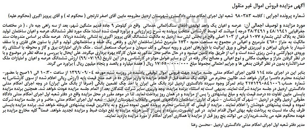 مورد مزایده و توصیف اجمالی آنعرصه و اعیان یک واحد تولیدی (ذغال سنگ)تمانی خدماتی  واقع در کیلومتر 9 جاده قدیم مشگین شهر، بعد از سه راهی جبه دار ، ( در مختصات جغرافیایی 48/1941 و 38/3491 درجه ) میباشد که توسط کارشناس منتخب پرونده به شرح زیرارزیابی و برآورد قیمت شده است؛ ملک مورد نظر ششدانگ عرصه و اعیان ساختمان تولید ذغال به پلاک ثبتی بشماره 1077 فرعی از 103 اصلی واقع در بخش ثبتی سه اردبیل به مالکیت ششدانگ آقای پرویز اکبری به نشانی یادشده دربالا،  عرصه ملک بر اساس مندرجات سند مالکیت به متراژ 4650 مترمربع و اعیانی در مجموع به مساحت حدود 1730 مترمربع شامل ساختمان اداری و رفاهی یک طبقه و ساختمانهای تولید و انبار با ستون های فلزی و با سقف شیبدار با خرپای تیراهن و تیرریزی قوطی و ورق ایرانیت با دیوارهای اجری و رویه سیمانی و کف سیمان و سرامیک مستعمل است . ملک دارای امتیازات برق و گاز و محوطه با استثنای راه ورودی دیوارکشی و شن ریزی شده است و آب از طریق چاه تامین میشود و در حال حاضر محل مذکور به عنوان کارگاه بهره برداری میگردد. علی ایحال با بررسی و مداقه نظر در موضوع و با در نظر گرفتن متراژ و موقعیت مکانی و نوع اعیانی و مصالح بکار رفته در آن و سایر عوامل موثر در کارشناسی و در این تاریخ (99/07/19) ارزش ششدانگ عرصه و اعیان و امتیازات ملک صدرالاشاره بدون در نظر گرفتن بدهی ها و جرایم احتمالی مجموعاً مبلغ 17/550/000/000 ریال ( هفده میلیارد و پانصد و پنجاه میلیون ریال ) براورد می گردد.