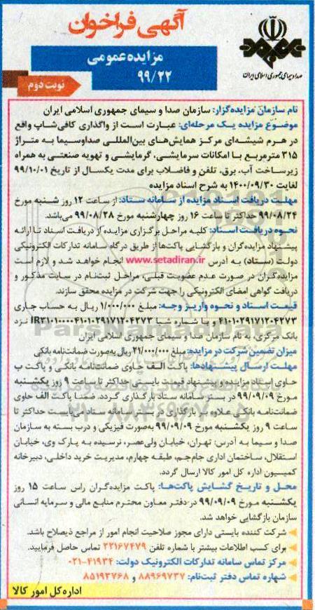 موضوع مزایده یک مرحله ای: عبارت است از واگذاری کافی شاپ واقع در هرم شیشه ای مرکز همایش های بین المللی صدا و سیما به متراژ 315 مترمربع با امکانات سرمایشی ، گرمایشی و تهویه صنعتی به همراه زیرساخت آب ، برق ، تلفن و فاضلاب برای مدت یک سال از تاریخ 99.10.01 تا 1400.09.30 به شرح اسناد مزایده