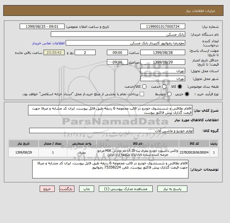 استعلام اقلام نظافتی و شستشوی خودرو در قالب مجموعه 6 ردیفه طبق فایل پیوست. ایران کد مشابه و صرفا جهت قیمت گذاری پیش فاکتور پیوست, استعلام اقلام نظافتی و شستشوی خودرو در قالب مجموعه 6 ردیفه طبق فایل پیوست. ایران کد مشابه و صرفا جهت قیمت گذاری پیش فاکتور پیوست