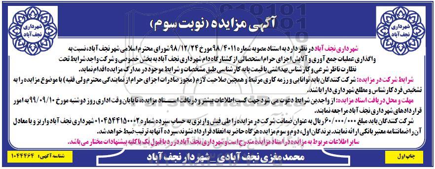 شهرداری نجف آباد درنظردارد نسبت به واگذاری عملیات جمع آوری و آلایش اجزای حرام استحصالی از کشتارگاه دام شهرداری نجف آباد به بخش خصوصی و شرکت واجد شرایط تحت نظارت ناظر شرعی و کارشناسی بهداشتی با قیمت پایه کارشناسی طبق مشخصات و شرایط موجود در مدارک مزایده اقدام نمایند