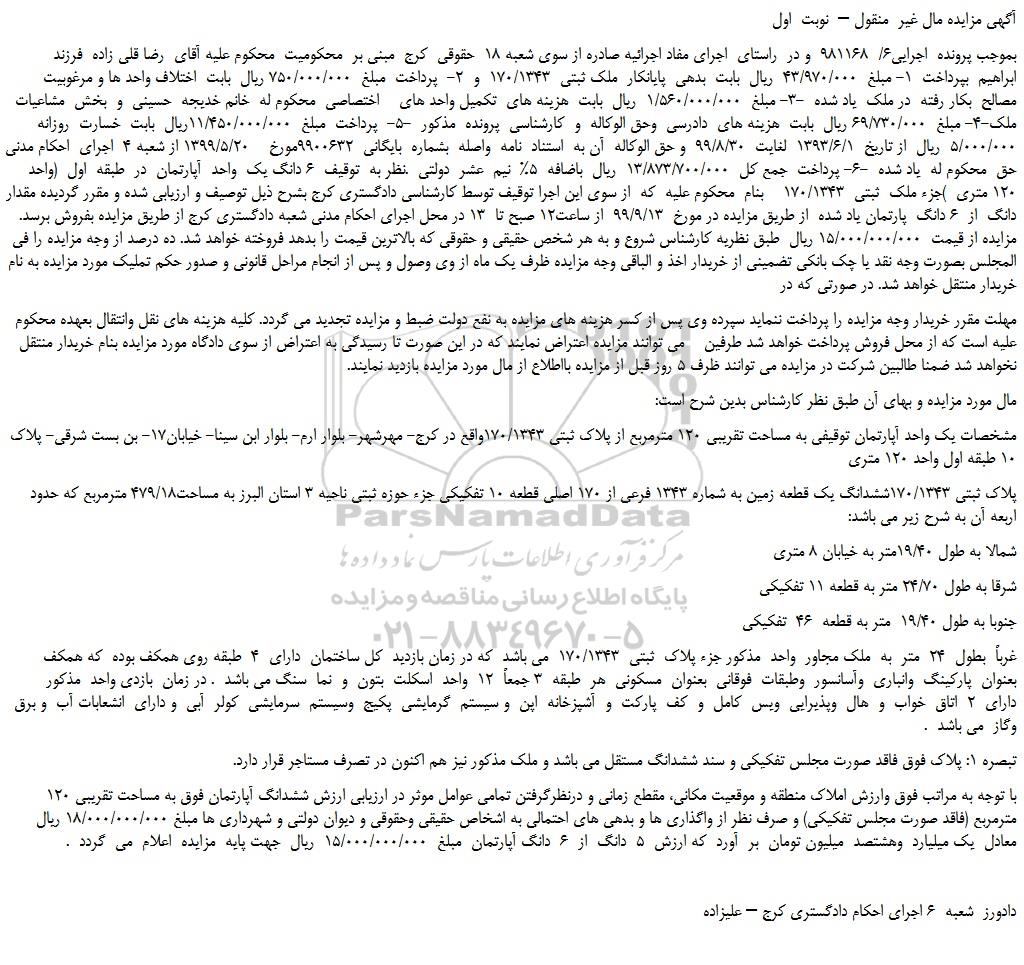 بموجب پرونده اجرایی6/ 981168 و در راستای اجرای مفاد اجرائیه صادره از سوی شعبه 18 حقوقی کرج مبنی بر محکومیت محکوم علیه آقای رضا قلی زاده فرزند ابراهیم بپرداخت 1- مبلغ 43/970/000 ریال بابت بدهی پایانکار ملک ثبتی 170/1343 و 2- پرداخت مبلغ 750/000/000 ریال بابت اختلاف واحد ها و مرغوبیت مصالح بکار رفته در ملک یاد شده -3- مبلغ 1/560/000/000 ریال بابت هزینه های تکمیل واحد های اختصاصی محکوم له خانم خدیجه حسینی و بخش مشاعیات ملک-4- مبلغ 69/730/000 ریال بابت هزینه های دادرسی وحق الوکاله و کارشناسی پرونده مذکور -5- پرداخت مبلغ 11/450/000/000ریال بابت خسارت روزانه 5/000/000 ریال از تاریخ 1393/6/1 لغایت 99/8/30 و حق الوکاله آن به استناد نامه واصله بشماره بایگانی 9900632مورخ 1399/5/20 از شعبه 4 اجرای احکام مدنی کرج در حق محکوم له یاد شده -6- پرداخت جمع کل 13/873/700/000 ریال باضافه 5% نیم عشر دولتی .نظر به توقیف 6 دانگ یک واحد آپارتمان در طبقه اول (واحد 120 متری )جزء ملک ثبتی 170/1343 بنام محکوم علیه که از سوی این اجرا توقیف توسط کارشناسی دادگستری کرج بشرح ذیل توصیف و ارزیابی شده و مقرر گردیده مقدار 5 دانگ از 6 دانگ پارتمان یاد شده از طریق مزایده در مورخ 99/9/13 از ساعت12 صبح تا 13 در محل اجرای احکام مدنی شعبه دادگستری کرج از طریق مزایده بفروش برسد. مزایده از قیمت 15/000/000/000 ریال طبق نظریه کارشناس شروع و به هر شخص حقیقی و حقوقی که بالاترین قیمت را بدهد فروخته خواهد شد. ده درصد از وجه مزایده را فی المجلس بصورت وجه نقد یا چک بانکی تضمینی از خریدار اخذ و الباقی وجه مزایده ظرف یک ماه از وی وصول و پس از انجام مراحل قانونی و صدور حکم تملیک مورد مزایده به نام خریدار منتقل خواهد شد. در صورتی که در