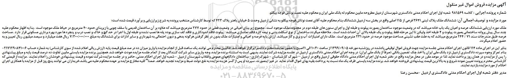 شماره پرونده اجرایی : کلاسه 981569 شعبه اول اجرای احکام مدنی دادگستری شهرستان اردبیل مطروحه مابین محکوم له بانک ملی ایران و محکوم علیه نعمت نوتاش قوجه بیگلو.