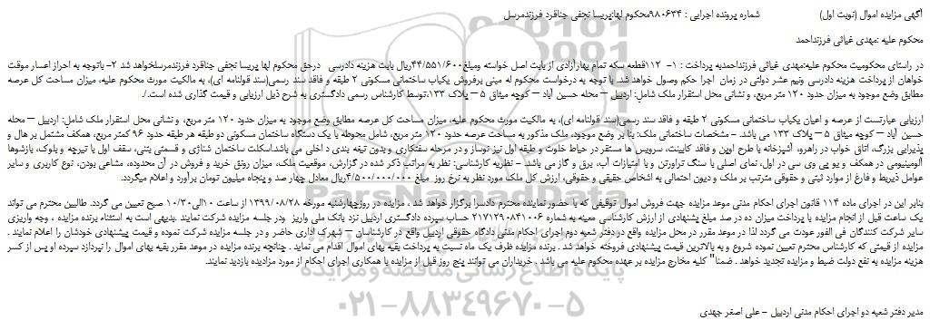 آگهی مزایده اموال (نوبت اول) شماره پرونده اجرایی : 980634محکوم لها:پریسا نجفی جناقرد فرزندمرسل