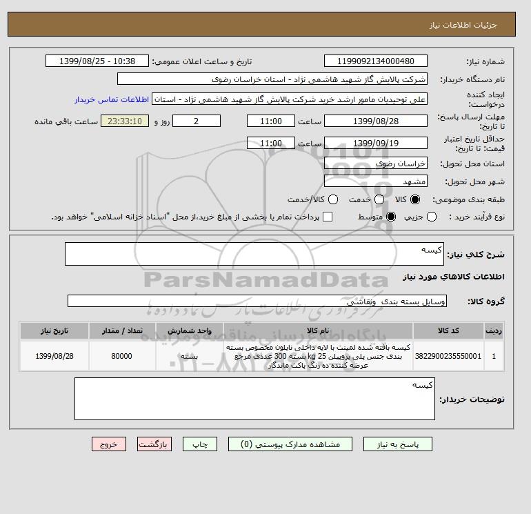 نام دستگاه خریدار:شرکت پالایش گاز شهید هاشمی نژاد - استان خراسان رضوی