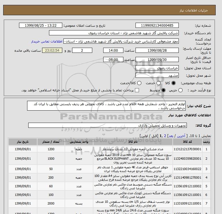 شرح کلی نیاز: لوازم التحریر - واحد شمارش همه اقلام عدد می باشد . کالای تحویلی هر ردیف بایستی مطابق با ایران کد درخواستی باشد .