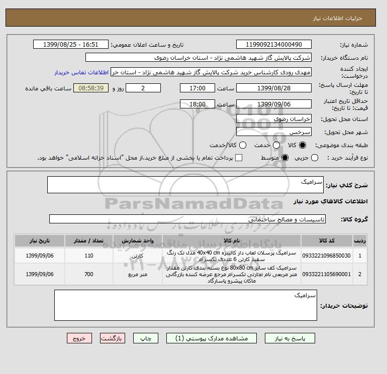 نام دستگاه خریدار:شرکت پالایش گاز شهید هاشمی نژاد - استان خراسان رضوی