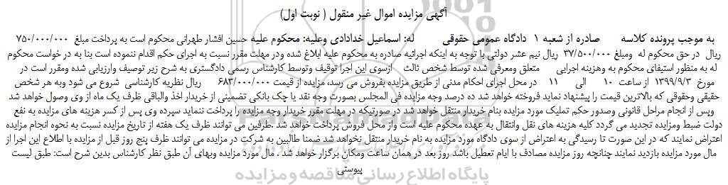به موجب پرونده کلاسه صادره از شعبه 1 دادگاه عمومی حقوقی له: اسماعیل خدادادی وعلیه: محکوم علیه حسین افشار طهرانی محکوم است به پرداخت مبلغ 750/000/000 ریال در حق محکوم له ومبلغ 37/500/000 ریال نیم عشر دولتی با توجه به اینکه اجرائیه صادره به محکوم علیه ابلاغ شده ودر مهلت مقرر نسبت به اجرای حکم اقدام ننموده است بنا به در خواست محکوم له به منظور استیفای محکوم به وهزینه اجرایی متعلق ومعرفی شده توسط شخص ثالث ازسوی این اجرا توقیف وتوسط کارشناس رسمی دادگستری به شرح زیر توصیف وارزیابی شده ومقرر است در مورخ 1399/9/3 از ساعت 10 الی 11 در محل اجرای احکام مدنی از طریق مزایده بفروش می رسد، مزایده از قیمت 683/000/000 ریال نظریه کارشناسی شروع می شود وبه هر شخص حقیقی وحقوقی که بالاترین قیمت را پیشنهاد نماید فروخته خواهد شد ده درصد وجه مزایده فی المجلس بصورت وجه نقد یا چک بانکی تضمینی از خریدار اخذ والباقی ظرف یک ماه از وی وصول خواهد شد وپس از انجام مراحل قانونی وصدور حکم تملیک مورد مزایده بنام خریدار منتقل خواهد شد در صورتیکه در مهلت مقرر خریدار وجه مزایده را پرداخت ننماید سپرده وی پس از کسر هزینه های مزایده به نفع دولت ضبط ومزایده تجدید می گردد کلیه هزینه های نقل وانتقال به عهده محکوم علیه است واز محل فروش پرداخت خواهد شد .طرفین می توانند ظرف یک هفته از تاریخ مزایده نسبت به نحوه انجام مزایده اعتراض نمایند که در این صورت تا رسیدگی به اعتراض از سوی دادگاه مورد مزایده به نام خریدار منتقل نخواهد شد ضمنا طالبین به شرکت در مزایده می توانند ظرف پنج روز قبل از مزایده با اطلاع این اجرا از مال مورد مزایده بازدید نمایند چنانچه روز مزایده مصادف با ایام تعطیل باشد روز بعد در همان ساعت ومکان برگزار خواهد شد . مال مورد مزایده وبهای آن طبق نظر کارشناس بدین شرح است: طبق لیست پیوستی