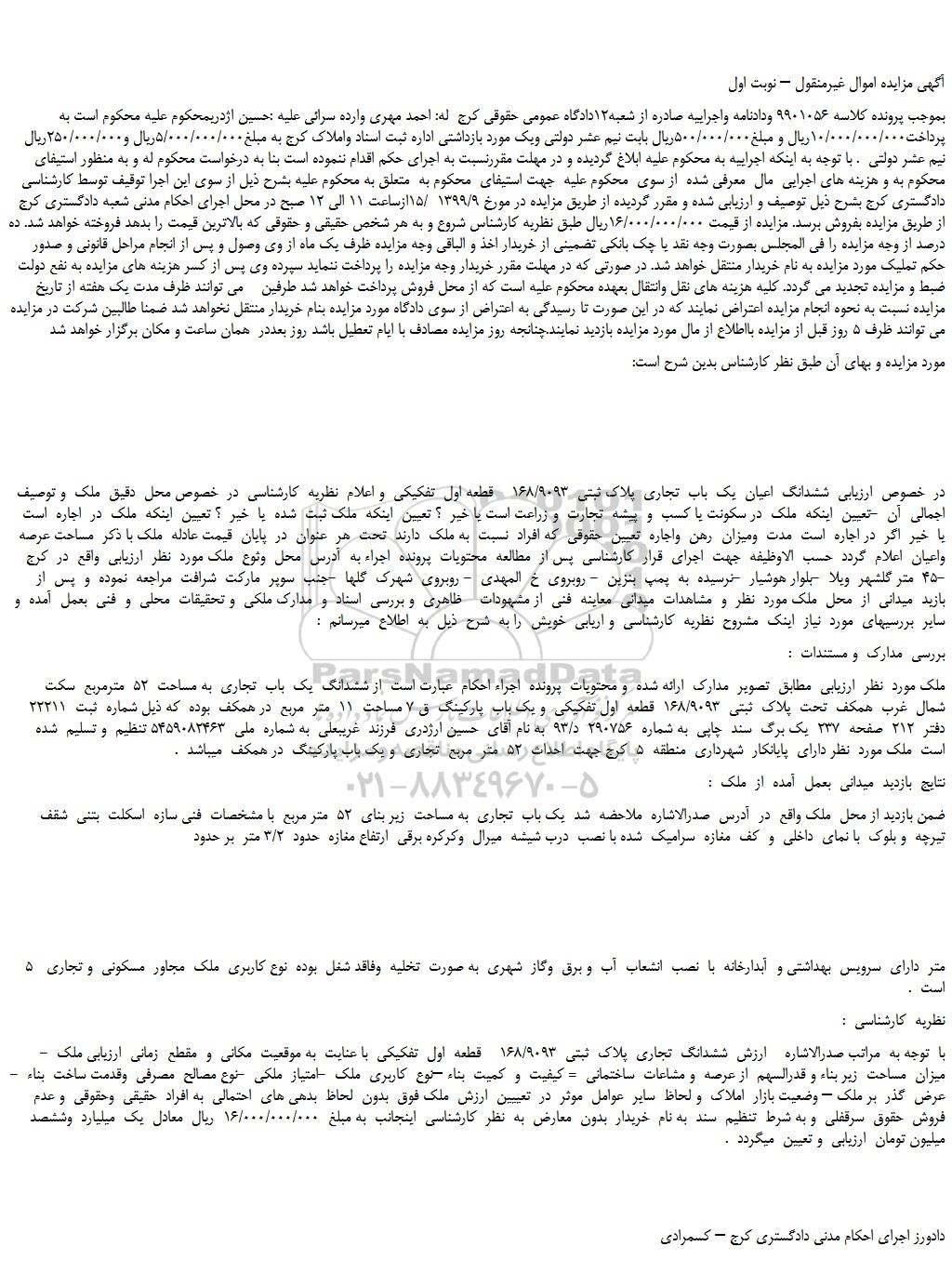 بموجب پرونده کلاسه 9901056 ودادنامه واجراییه صادره از شعبه12دادگاه عمومی حقوقی کرج  له: احمد مهری وارده سرائی علیه :حسین اژدریمحکوم علیه محکوم است به پرداخت10/000/000/000ریال و مبلغ500/000/000ریال بابت نیم عشر دولتی ویک مورد بازداشتی اداره ثبت اسناد واملاک کرج به مبلغ5/000/000/000ریال و250/000/000ریال نیم عشر دولتی  . با توجه به اینکه اجراییه به محکوم علیه ابلاغ گردیده و در مهلت مقررنسبت به اجرای حکم اقدام ننموده است بنا به درخواست محکوم له و به منظور استیفای محکوم به و هزینه های اجرایی  مال  معرفی شده  از سوی  محکوم علیه  جهت استیفای  محکوم به  متعلق به محکوم علیه بشرح ذیل از سوی این اجرا توقیف توسط کارشناسی دادگستری کرج بشرح ذیل توصیف و ارزیابی شده و مقرر گردیده از طریق مزایده در مورخ 1399/9  /15ازساعت 11 الی 12 صبح در محل اجرای احکام مدنی شعبه دادگستری کرج از طریق مزایده بفروش برسد. مزایده از قیمت 16/000/000/000ریال طبق نظریه کارشناس شروع و به هر شخص حقیقی و حقوقی که بالاترین قیمت را بدهد فروخته خواهد شد. ده درصد از وجه مزایده را فی المجلس بصورت وجه نقد یا چک بانکی تضمینی از خریدار اخذ و الباقی وجه مزایده ظرف یک ماه از وی وصول و پس از انجام مراحل قانونی و صدور حکم تملیک مورد مزایده به نام خریدار منتقل خواهد شد. در صورتی که در مهلت مقرر خریدار وجه مزایده را پرداخت ننماید سپرده وی پس از کسر هزینه های مزایده به نفع دولت ضبط و مزایده تجدید می گردد. کلیه هزینه های نقل وانتقال بعهده محکوم علیه است که از محل فروش پرداخت خواهد شد طرفین    می توانند ظرف مدت یک هفته از تاریخ مزایده نسبت به نحوه انجام مزایده اعتراض نمایند که در این صورت تا رسیدگی به اعتراض از سوی دادگاه مورد مزایده بنام خریدار منتقل نخواهد شد ضمنا طالبین شرکت در مزایده می توانند ظرف 5 روز قبل از مزایده بااطلاع از مال مورد مزایده بازدید نمایند.چنانجه روز مزایده مصادف با ایام تعطیل باشد روز بعددر  همان ساعت و مکان برگزار خواهد شد