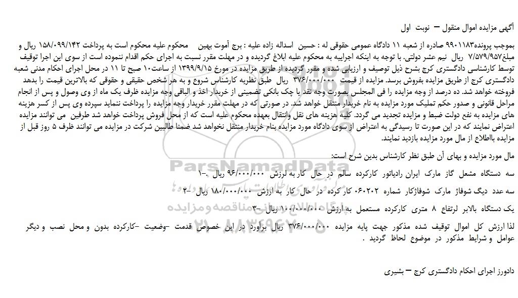 بموجب پرونده9901183 صادره از شعبه 11 دادگاه عمومی حقوقی له : حسین  اسداله زاده علیه : برج آموت بهین    محکوم علیه محکوم است به پرداخت 158/099/142 ریال و مبلغ7/579/957  ریال  نیم عشر دولتی. با توجه به اینکه اجراییه به محکوم علیه ابلاغ گردیده و در مهلت مقرر نسبت به اجرای حکم اقدام ننموده است از سوی این اجرا توقیف توسط کارشناسی دادگستری کرج بشرح ذیل توصیف و ارزیابی شده و مقرر گردیده از طریق مزایده در مورخ 1399/9/15 از ساعت10 صبح تا 11 در محل اجرای احکام مدنی شعبه دادگستری کرج از طریق مزایده بفروش برسد. مزایده از قیمت  376/000/000  ریال  طبق نظریه کارشناس شروع و به هر شخص حقیقی و حقوقی که بالاترین قیمت را بدهد فروخته خواهد شد. ده درصد از وجه مزایده را فی المجلس بصورت وجه نقد یا چک بانکی تضمینی از خریدار اخذ و الباقی وجه مزایده ظرف یک ماه از وی وصول و پس از انجام مراحل قانونی و صدور حکم تملیک مورد مزایده به نام خریدار منتقل خواهد شد. در صورتی که در مهلت مقرر خریدار وجه مزایده را پرداخت ننماید سپرده وی پس از کسر هزینه های مزایده به نفع دولت ضبط و مزایده تجدید می گردد. کلیه هزینه های نقل وانتقال بعهده محکوم علیه است که از محل فروش پرداخت خواهد شد طرفین  می توانند مزایده اعتراض نمایند که در این صورت تا رسیدگی به اعتراض از سوی دادگاه مورد مزایده بنام خریدار منتقل نخواهد شد ضمنا طالبین شرکت در مزایده می توانند ظرف 5 روز قبل از مزایده بااطلاع از مال مورد مزایده بازدید نمایند.