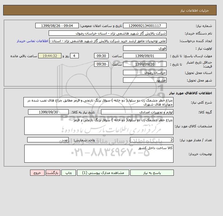 نام دستگاه خریدار:شرکت پالایش گاز شهید هاشمی نژاد - استان خراسان رضوی
