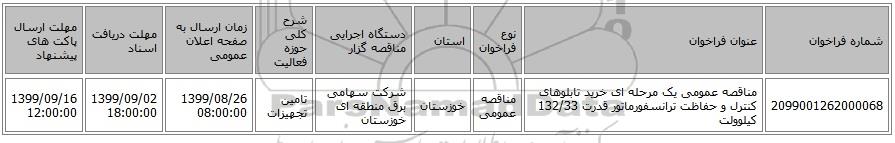 | 2099001262000068 | مناقصه عمومی یک مرحله ای خرید تابلوهای کنترل و حفاظت ترانسفورماتور قدرت 132/33 کیلوولت | مناقصه عمومی | خوزستان | شرکت سهامی برق منطقه ای خوزستان | تامین تجهیزات | 1399/08/26 08:00:00 | 1399/09/02 18:00:00 | 1399/09/16 12:00:00 |