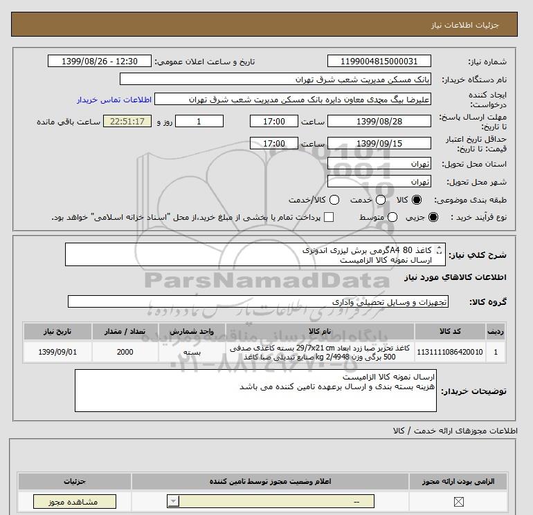 نام دستگاه خریدار:بانک مسکن مدیریت شعب شرق تهران