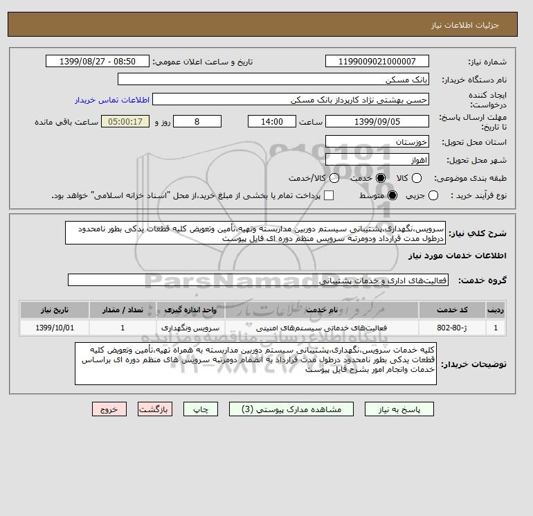 شرح کلی نیاز: سرویس،نگهداری،پشتیبانی سیستم دوربین مداربسته وتهیه،تأمین وتعویض کلیه قطعات یدکی بطور نامحدود درطول مدت قرارداد ودومرتبه سرویس منظم دوره ای فایل پیوست
