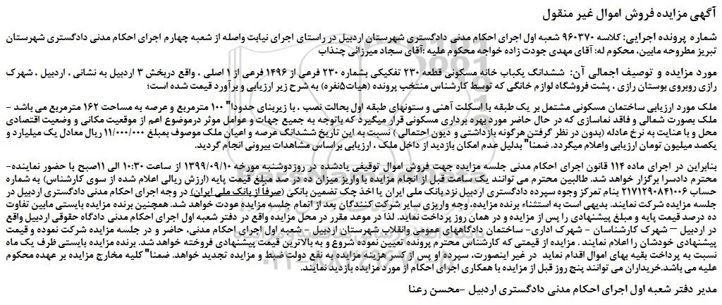 شماره پرونده اجرایی: کلاسه 960370 شعبه اول اجرای احکام مدنی دادگستری شهرستان اردبیل در راستای اجرای نیابت واصله از شعبه چهارم اجرای احکام مدنی دادگستری شهرستان تبریز مطروحه مابین، محکوم له: آقای مهدی جودت زاده خواجه محکوم علیه :آقای سجاد میرزائی چنذاب