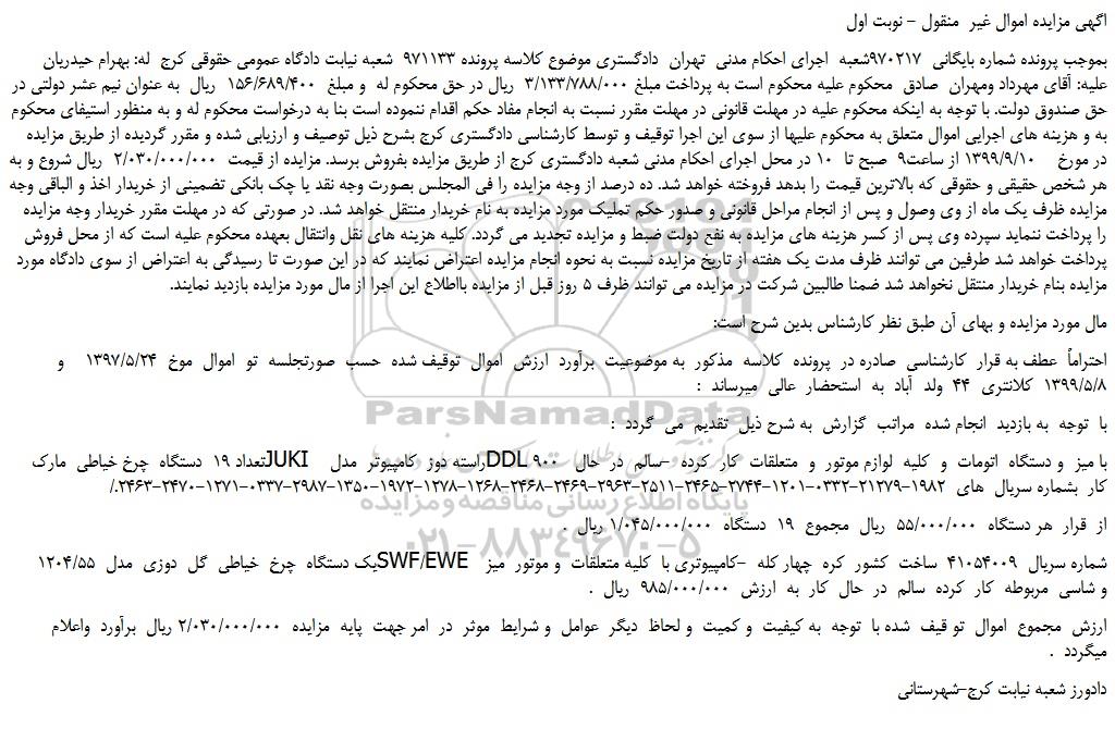 بموجب پرونده شماره بایگانی 970217شعبه اجرای احکام مدنی تهران دادگستری موضوع کلاسه پرونده 971133 شعبه نیابت دادگاه عمومی حقوقی کرج له: بهرام حیدریان علیه: آقای مهرداد ومهران صادق محکوم علیه محکوم است به پرداخت مبلغ 3/133/788/000 ریال در حق محکوم له و مبلغ 156/689/400 ریال به عنوان نیم عشر دولتی در حق صندوق دولت. با توجه به اینکه محکوم علیه در مهلت قانونی در مهلت مقرر نسبت به انجام مفاد حکم اقدام ننموده است بنا به درخواست محکوم له و به منظور استیفای محکوم به و هزینه های اجرایی اموال متعلق به محکوم علیها از سوی این اجرا توقیف و توسط کارشناسی دادگستری کرج بشرح ذیل توصیف و ارزیابی شده و مقرر گردیده از طریق مزایده در مورخ 1399/9/10 از ساعت9 صبح تا 10 در محل اجرای احکام مدنی شعبه دادگستری کرج از طریق مزایده بفروش برسد. مزایده از قیمت 2/030/000/000 ریال شروع و به هر شخص حقیقی و حقوقی که بالاترین قیمت را بدهد فروخته خواهد شد. ده درصد از وجه مزایده را فی المجلس بصورت وجه نقد یا چک بانکی تضمینی از خریدار اخذ و الباقی وجه مزایده ظرف یک ماه از وی وصول و پس از انجام مراحل قانونی و صدور حکم تملیک مورد مزایده به نام خریدار منتقل خواهد شد. در صورتی که در مهلت مقرر خریدار وجه مزایده را پرداخت ننماید سپرده وی پس از کسر هزینه های مزایده به نفع دولت ضبط و مزایده تجدید می گردد. کلیه هزینه های نقل وانتقال بعهده محکوم علیه است که از محل فروش پرداخت خواهد شد طرفین می توانند ظرف مدت یک هفته از تاریخ مزایده نسبت به نحوه انجام مزایده اعتراض نمایند که در این صورت تا رسیدگی به اعتراض از سوی دادگاه مورد مزایده بنام خریدار منتقل نخواهد شد ضمنا طالبین شرکت در مزایده می توانند ظرف 5 روز قبل از مزایده بااطلاع این اجرا از مال مورد مزایده بازدید نمایند.