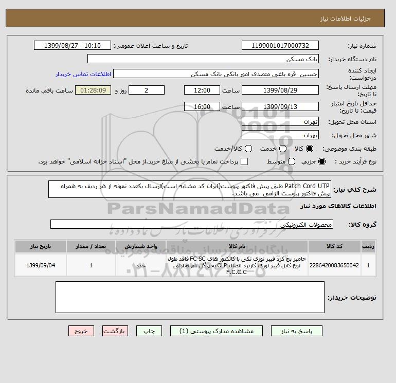 شرح کلی نیاز: Patch Cord UTP طبق پیش فاکتور پیوست(ایران کد مشابه است)ارسال یکعدد نمونه از هر ردیف به همراه پیش فاکتور پیوست الزامی می باشد.