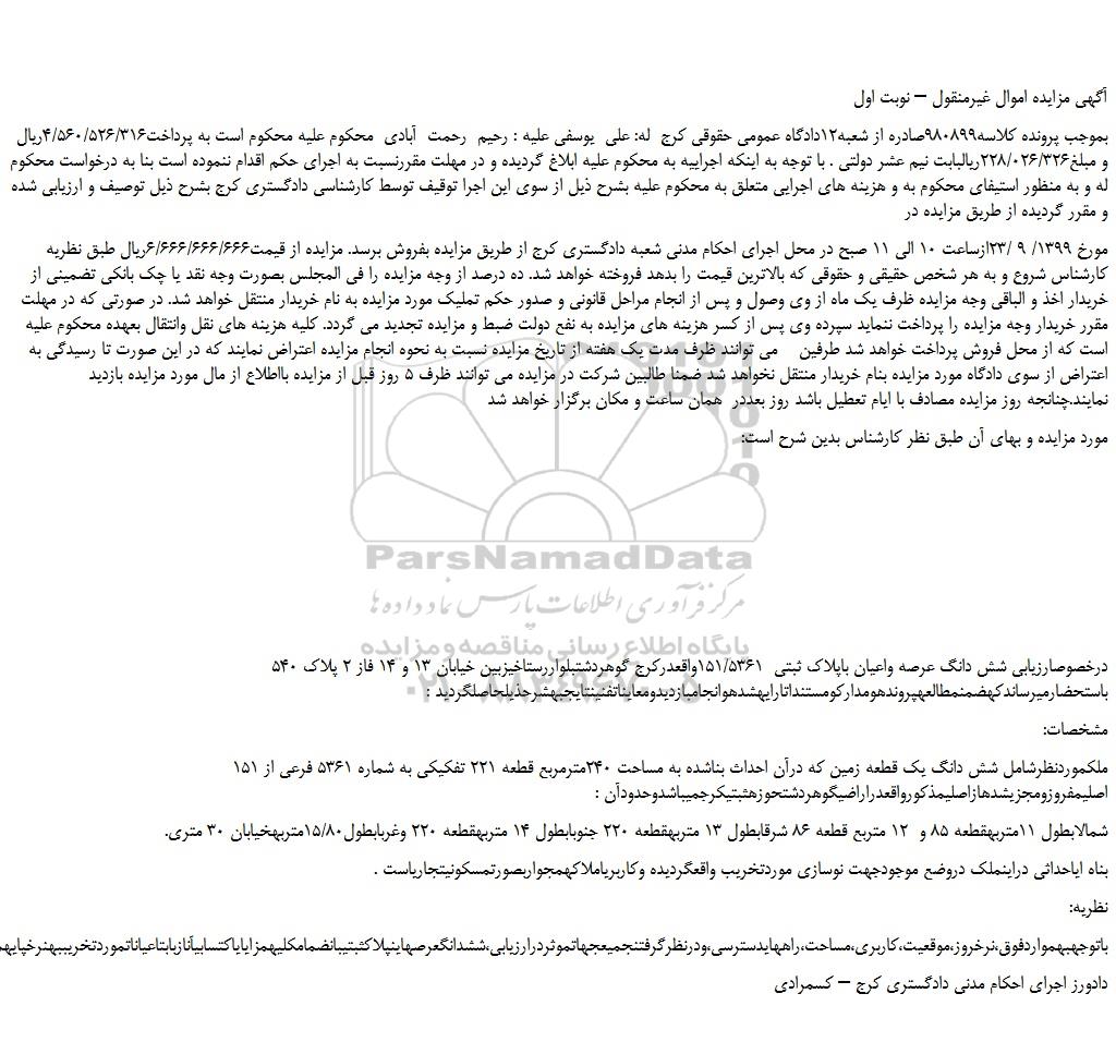 بموجب پرونده کلاسه980899صادره از شعبه12دادگاه عمومی حقوقی کرج له: علی یوسفی علیه : رحیم رحمت آبادی محکوم علیه محکوم است به پرداخت4/560/526/316ریال و مبلغ228/026/326ریالبابت نیم عشر دولتی . با توجه به اینکه اجراییه به محکوم علیه ابلاغ گردیده و در مهلت مقررنسبت به اجرای حکم اقدام ننموده است بنا به درخواست محکوم له و به منظور استیفای محکوم به و هزینه های اجرایی متعلق به محکوم علیه بشرح ذیل از سوی این اجرا توقیف توسط کارشناسی دادگستری کرج بشرح ذیل توصیف و ارزیابی شده و مقرر گردیده از طریق مزایده در