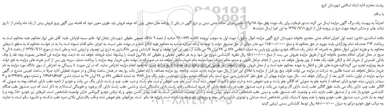 مائده اسکندری-دادورز شعبه اول اجرای احکام مدنی مجتمع خانواده شهرستان کرج آگهی مزایده اموال منقول- نوبت اول به موجب پرونده کلاسه 9900777 صادره از شعبه 9 دادگاه عمومی حقوقی شهرستان زنجان لها: خانم سمیه قزلباش علیه: آقای علی ایواز محکوم علیه محکوم است به پرداخت 314 عددسکه تمام بهارآزادی بابت مهریه در حق محکوم له و مبلغ 115/000/0000 نیم عشر دولتی در حق صندوق دولت با توجه به اینکه اجرائیه صادره به محکوم علیه ابلاغ شده و در مهلت مقرر نسبت به اجرای حکم اقدام ننموده است بنا به در خواست محکوم له به منظور استیفای محکوم به و هزینه اجرایی اموال متعلق به نامبرده که شامل یک دستگاه خودرو سواری پژو پارس به شماره انتظامی 528 ی 38 ایران 38 می باشد، از سوی این اجرا توقیف و توسط کارشناس رسمی دادگستری به شرح زیر توصیف و ارزیابی شده و مقرر است در مورخ 1399/09/11 از ساعت 8 الی 9 صبح در محل اجرای احکام مجتمع خانواده کرج از طریق مزایده بفروش می رسد، از مبلغ 850/000/000 ریال نظریه کارشناسی شروع می شود و به هر شخص حقیقی و حقوقی که بالاترین قیمت را پیشنهاد نماید فروخته خواهد شد ده درصد وجه مزایده فی المجلس بصورت وجه نقد یا چک بانکی تضمینی از خریدار اخذ و الباقی ظرف یک هفته از وی وصول خواهد شد و پس از انجام مراحل قانونی و صدور حکم تملیک مورد مزایده بنام خریدار منتقل خواهد شد در صورتیکه در مهلت مقرر خریدار وجه مزایده را پرداخت ننماید سپرده وی پس از کسر هزینه های مزایده به نفع دولت ضبط ومزایده تجدید می گرددکلیه هزینه های نقل و انتقال به عهده محکوم علیه است و از محل فروش پرداخت خواهد شد. طرفین می توانند ظرف یک هفته از تاریخ مزایده نسبت به نحوه انجام مزایده اعتراض نمایند که در این صورت تا رسیدگی به اعتراض از سوی دادگاه مورد مزایده به نام خریدار منتقل نخواهد شد ضمنا طالبین به شرکت در مزایده می توانند ظرف پنج روز قبل از مزایده با اطلاع این اجرا از مال مورد مزایده بازدید نمایند. چنانچه روز مزایده مصادف با ایام تعطیل باشد روز بعد در همان ساعت ومکان و در صورت تعطیلی اداره صرفا در ساعت تعیینی مندرج در آگهی مراسم مزایده در اولین ساعت کاری بعد از آن برگزار خواهد شد . مال مورد مزایده وبهای آن طبق نظر کارشناس بدین شرح است: یک دستگاه خودرو سواری پژو پارس سفید رنگ مدل 1386 به شماره انتظامی 528 ی 38 ایران 38 به شماره شاسی 12486154853 و شماره موتور 50334535 و 4 سیلندر بنزینی، بدنه خودرو دارای تصادف از ناحیه جلو به صورتی که گلگیر جلو راست و چپ تعویض شده و درب موتور (کاپوت) تعویض شده است. درب جلو چپ تعویض و درب جلو راست و درب عقب چپ و راست دارای رنگ می باشد و خودرو از ناحیه عقب دارای تصادف بوده به صورتی که گلگیر عقب چپ دارای رنگ می باشد. طوق گلگیر عقب راست دارای آثار برخورد می باشد و درب صندوق عقب در یک نقطه دارای آثار ضربه است.قاب رکاب راست دارای شکستگی است و شاسی عقب راست دارای آثار برخورد و دفورمگی است.لازم به ذکر است که درب صندوق عقب هنگام کارشناسی خودرو باز نشد و از صندوق عقب بازدید نشد و وضعیت کف صندوق عقب و سینی عقب نامشخص است. موتور روشن نشده و دارای وضعیت نامشخص است. به علت روشن نشدن موتور و راه نرفتن خودرو گیربکس دارای وضعیت نامشخص است. تایرهای زیر خودرو 50% بوده و با توجه به باز نشدن درب صندوق عقب خودرو وجود یا عدم وجود لاستیک زاپاس نامشخص است. صندلی و تودوزی دارای روکش بوده و سپرهای جلو و عقب شکسته است. شیشه ها سالم  است، چراغهای جلو تعویض شده و قاب پلاستیکی بالای نمره عقب شکسته و داشبورد سالم است. با عنایت به مراتب فوق خودرو مزکور به میزان 850/000/000 ریال توسط کارشناس رسمی ارزیابی گردید.