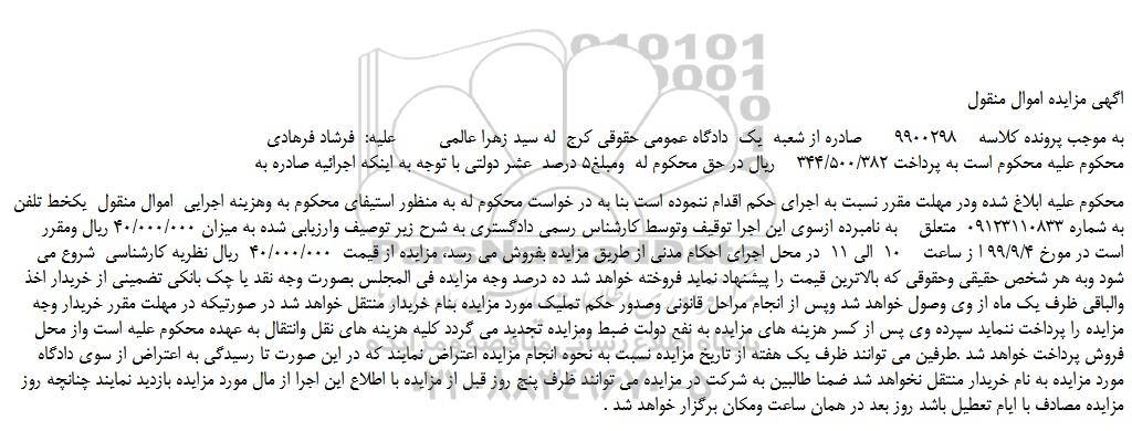 به موجب پرونده کلاسه 9900298 صادره از شعبه یک دادگاه عمومی حقوقی کرج له سید زهرا عالمی علیه: فرشاد فرهادی محکوم علیه محکوم است به پرداخت 344/500/382 ریال در حق محکوم له ومبلغ5 درصد عشر دولتی با توجه به اینکه اجرائیه صادره به