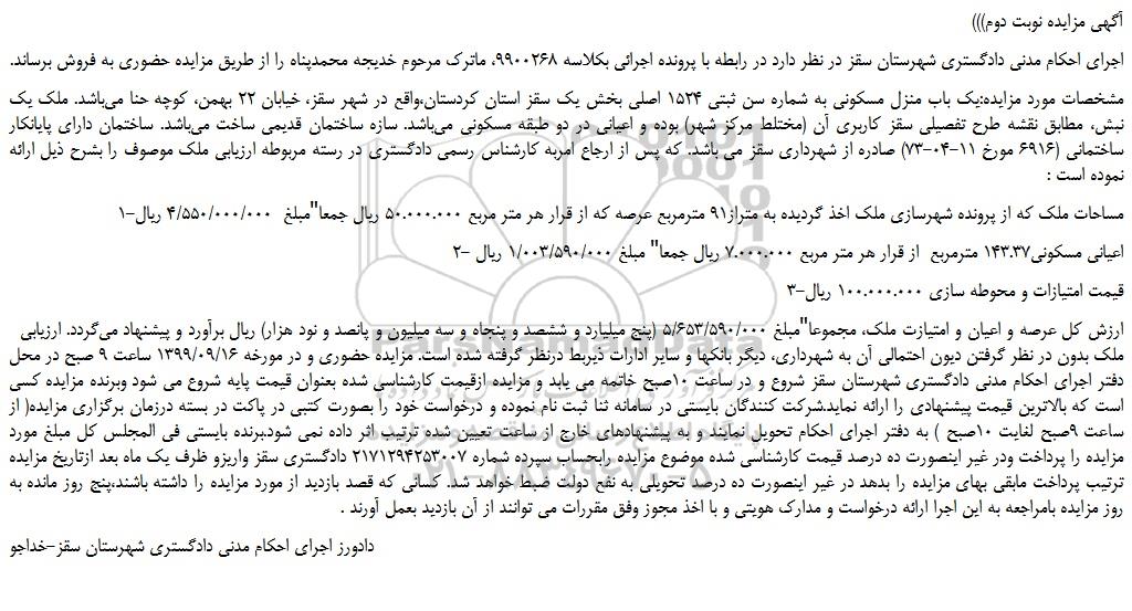 اجرای احکام مدنی دادگستری شهرستان سقز در نظر دارد در رابطه با پرونده اجرائی بکلاسه 9900268، ماترک مرحوم خدیجه محمدپناه را از طریق مزایده حضوری به فروش برساند.