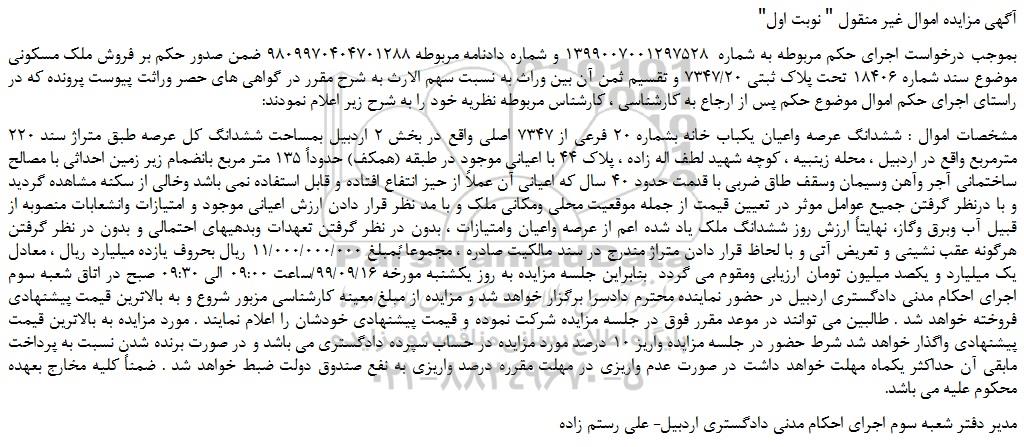مشخصات اموال : ششدانگ عرصه واعیان یکباب خانه بشماره 20 فرعی از 7347 اصلی واقع در بخش 2 اردبیل بمساحت ششدانگ کل عرصه طبق متراژ سند 220 مترمربع واقع در اردبیل ، محله زینبیه ، کوچه شهید لطف اله زاده ، پلاک 44 با اعیانی موجود در طبقه (همکف) حدوداً 135 متر مربع بانضمام زیر زمین احداثی با مصالح ساختمانی آجر وآهن وسیمان وسقف طاق ضربی با قدمت حدود 40 سال که اعیانی آن عملاً از حیز انتفاع افتاده و قابل استفاده نمی باشد وخالی از سکنه مشاهده گردید و با درنظر گرفتن جمیع عوامل موثر در تعیین قیمت از جمله موقعیت محلی ومکانی ملک و با مد نظر قرار دادن ارزش اعیانی موجود و امتیازات وانشعابات منصوبه از قبیل آب وبرق وگاز، نهایتاً ارزش روز ششدانگ ملک یاد شده اعم از عرصه واعیان وامتیازات ، بدون در نظر گرفتن تعهدات وبدهیهای احتمالی و بدون در نظر گرفتن هرگونه عقب نشینی و تعریض آتی و با لحاظ قرار دادن متراژ مندرج در سند مالکیت صادره ، مجموعا ًبمبلغ 11/000/000/000 ریال بحروف یازده میلیارد ریال ، معادل یک میلیارد و یکصد میلیون تومان ارزیابی ومقوم می گردد  بنابراین جلسه مزایده به روز یکشنبه مورخه 99/09/16/ساعت 09:00 الی 09:30 صبح در اتاق شعبه سوم اجرای احکام مدنی دادگستری اردبیل در حضور نماینده محترم دادسرا برگزار خواهد شد و مزایده از مبلغ معینه کارشناسی مزبور شروع و به بالاترین قیمت پیشنهادی فروخته خواهد شد . طالبین می توانند در موعد مقرر فوق در جلسه مزایده شرکت نموده و قیمت پیشنهادی خودشان را اعلام نمایند . مورد مزایده به بالاترین قیمت پیشنهادی واگذار خواهد شد شرط حضور در جلسه مزایده واریز 10 درصد مورد مزایده در حساب سپرده دادگستری می باشد و در صورت برنده شدن نسبت به پرداخت مابقی آن حداکثر یکماه مهلت خواهد داشت در صورت عدم واریزی در مهلت مقرره درصد واریزی به نفع صندوق دولت ضبط خواهد شد . ضمناً کلیه مخارج بعهده محکوم علیه می باشد.