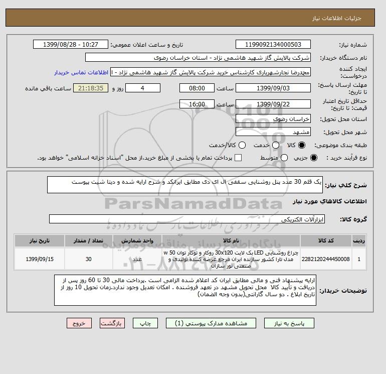 شرح کلی نیاز: یک قلم 30 عدد پنل روشنایی سقفی ال ای دی مطابق ایرانکد و شرح ارایه شده و دیتا شیت پیوست
