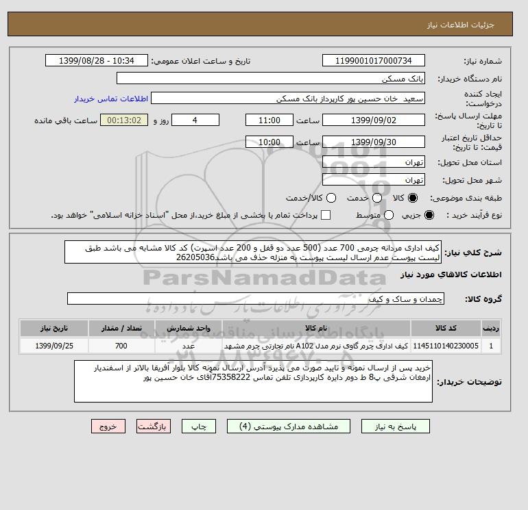 شرح کلی نیاز: کیف اداری مردانه چرمی 700 عدد (500 عدد دو قفل و 200 عدد اسپرت) کد کالا مشابه می باشد طبق لیست پیوست عدم ارسال لیست پیوست به منزله حذف می باشد26205036