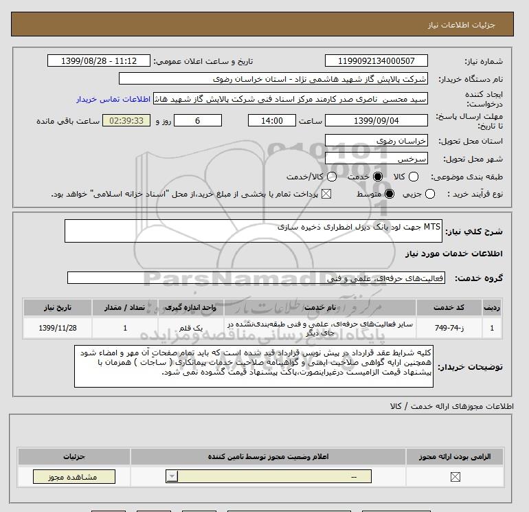 نام دستگاه خریدار:شرکت پالایش گاز شهید هاشمی نژاد - استان خراسان رضوی