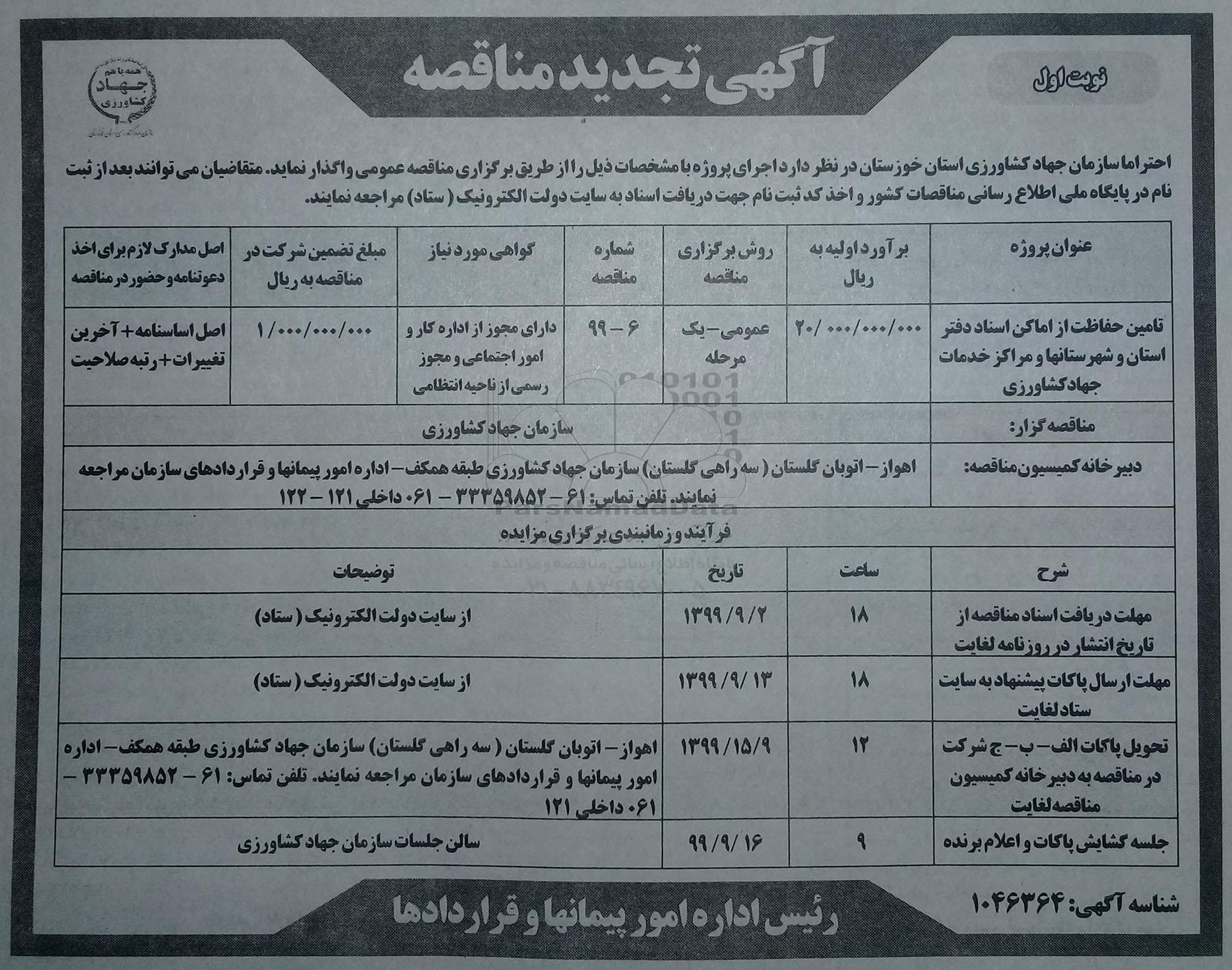 سازمان جهاد کشاورزی استان خوزستان در نظر دارد اجرای پروژه با مشخصات ذیل را از طریق برگزاری مناقصه عمومی واگذار نماید. متقاضیان می توانند بعد از ثبت نام در پایگاه ملی اطلاع رسانی مناقصات کشور و اخذ کد ثبت نام جهت دریافت اسناد به سایت دولت الکترونیک ستاد مراجعه نمایید