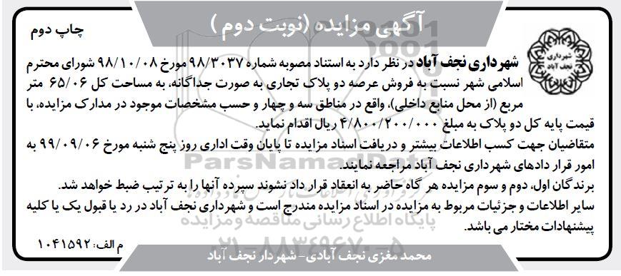 مزایده عمومی مزایده فروش عرصه دو پلاک تجاری 65.06 مترمربع نوبت دوم چاپ دوم برگزار میگردد. از کلیه افراد متخصص و شرکتهای واجد شرایط دعوت به عمل میآید تا در این مزایده با کد خبرگزاری پارس نماد : 2891106 شرکت نمایند تاریخ شروع مزایده : 1399/08/28 مهلت شرکت در مزایده: تا پایان روز 1399/09/06 مکان برگزاری اموال واگذاری استانهای اصفهان و دستهبندیهای مربوط به این حراجی املاک و زمین میباشد.