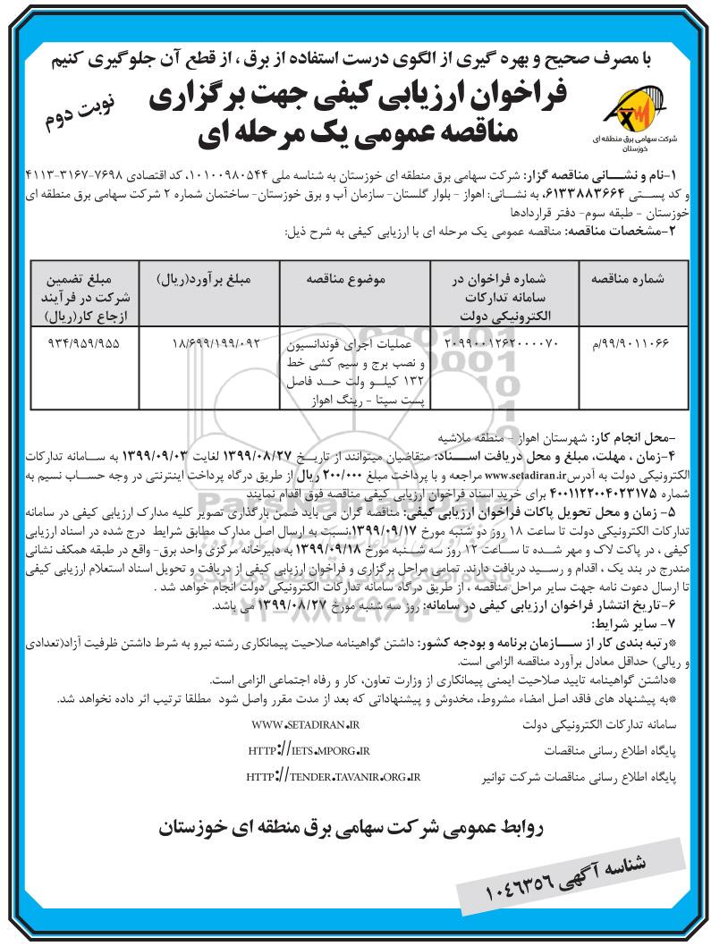 | 99/9011066/م | 2099001262000070 | عملیات اجرای فونداسیون و نصب برج و سیم کشی خط 132 کیلو ولت حد فاصل پست سپتا - رینگ اهواز |