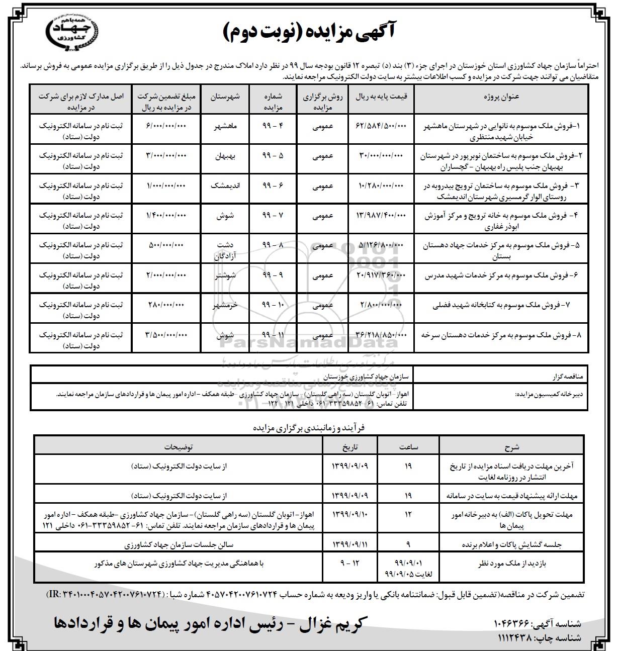 مزایده عمومی مزایده فروش املاک نوبت دوم برگزار میگردد. از کلیه افراد متخصص و شرکت‌های واجد شرایط دعوت به عمل می‌آید تا در این مزایده با کد خبرگزاری پارس نماد : 2891357 شرکت نمایند تاریخ شروع مزایده : 1399/08/28 مهلت شرکت در مزایده: تا پایان روز 1399/09/09 مکان برگزاری اموال واگذاری استان‌های مزایدات استان خوزستان و دسته‌بندی‌های مربوط به این حراجی املاک و زمین میباشد.