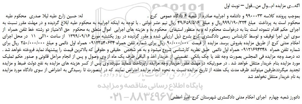بموجب پرونده کلاسه 9900033 و دادنامه و اجراییه صادره از شعبه 6 دادگاه عمومی کرج . له: حسین زارع علیه لیلا صدری محکوم علیه محکوم است به پرداخت مبلغ 999/190/324ریال و مبلغ 49/659/516 ریال نیم عشر دولتی . با توجه به اینکه اجراییه به محکوم علیه ابلاغ گردیده و در مهلت مقرر نسبت به اجرای حکم اقدام ننموده است بنا به درخواست محکوم له و به منظور استیفای محکوم به و هزینه های اجرایی اموال متعلق به محکوم حق الامتیاز دو رشته خط تلفن همراه از سوی این اجرا توقیف و توسط کارشناس رسمی دادگستری کرج بشرح ذیل ارزیابی شده و مقرر گردیده در روز یکشنبه مورخ 1399/09/16 از ساعت 10الی 11 در محل اجرای احکام مدنی کرج از طریق مزایده بفروش برسد. مزایده از قیمت 90/000/000 ریال برای شماره تلفن همراه 09123540634 همراه اول دائمی و مبلغ 250/000/000 ریال برای شماره تلفن همراه 09121694348 همراه اول دائمی طبق نظریه کارشناسی شروع میشود و به هر شخص حقیقی و حقوقی که بالاترین قیمت را پیشنهاد نماید فروخته خواهد شد . ده درصد وجه مزایده فی المجلس بصورت وجه نقد یا چک بانکی تضمینی از خریدار اخذ و الباقی ظرف یک ماه از وی وصول و پس از انجام مراحل قانونی و صدور حکم تملیک مورد مزایده بنام خریدار منتقل خواهد شد . در صورتیکه در مهلت مقرر خریدار وجه مزایده راپرداخت ننماید سپرده وی پس از کسر هزینه های مزایده به نفع دولت ضبط و مزایده تجدید میگردد.طرفین میتوانند ظرف مدت یک هفته از تاریخ مزایده نسبت به نحوه انجام مزایده اعتراض نمایند که در اینصورت تا رسیدگی به اعتراض از سوی دادگاه مورد مزایده به نام خریدار منتقل نخواهد شد
