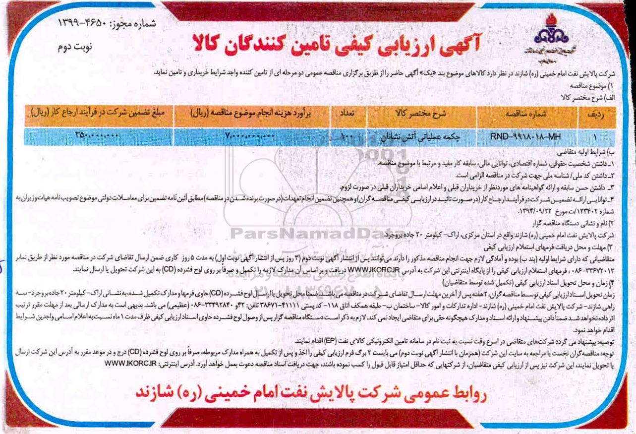 شرکت پالایش نفت امام خمینی (ره) شازند در نظر دارد کالاهای موضوع بند یک آگهی حاضر را از طریق برگزاری مناقصه عمومی دو مرحله ای از تامین کننده واجد شرایط خریداری و تامین نماید.