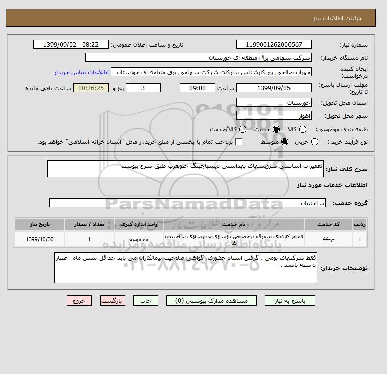 شرح کلی نیاز: تعمیرات اساسی سرویسهای بهداشتی دیسپاچینگ جنوبغرب طبق شرح پیوست