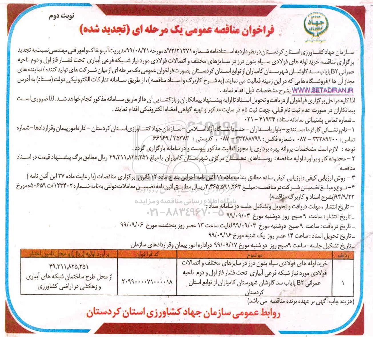 سازمان جهاد کشاورزی استان کردستان در نظر دارد مدیریت آب و خاک و امور فنی مهندسی نسبت به تجدید برگزاری مناقصه خرید لوله های فولادی سیاه بدون درز در سایزهای مختلف و اتصالات فولادی مورد نیاز شبکه فرعی آبیاری تحت فشار فاز اول ودوم ناحیه عمرانی B2 پایاب سد گاوشان شهرستان کامیاران از توابع استان کردستان بصورت فراخوان عمومی یک مرحله ای از میان شرکت های تولید کننده - نماینده مجاز ان - فروشگاه های که در این زمینه فعالیت می نمایند به شرح کار برگ و اسناد مناقصه از طریق سامانه تدارکات الکترونیکی دولت ستاد به آدرس ستاد ایران به شرح مشخصات ذیل