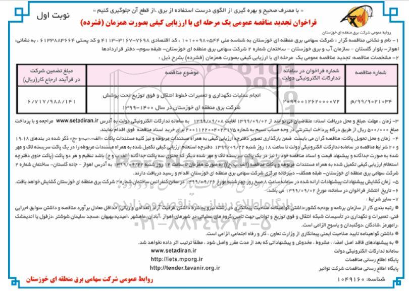 | 99/9021034/م | 2099001262000072 | انجام عملیات نگهداری و تعمیرات خطوط انتقال و فوق توزیع تحت پوشش شرکت برق منطقه ای خوزستان در سال 1399-1400 | 6.717.988.141 |