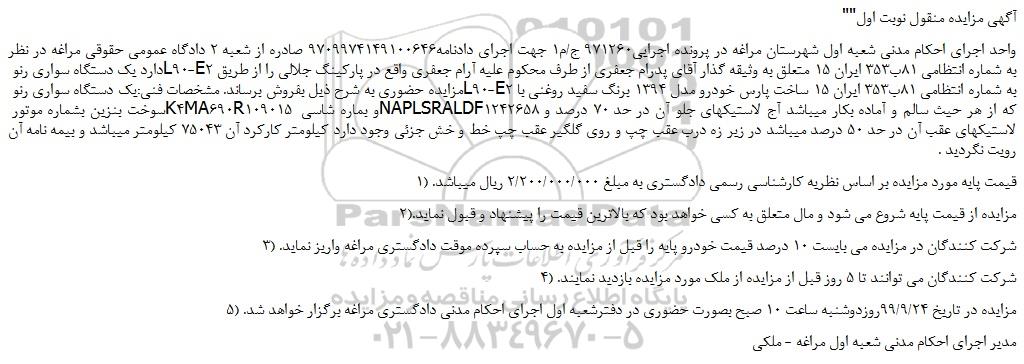 واحد اجرای احکام مدنی شعبه اول شهرستان مراغه در پرونده اجرایی971260 ج/م1 جهت اجرای دادنامه9709974149100646 صادره از شعبه 2 دادگاه عمومی حقوقی مراغه در نظر دارد یک دستگاه سواری رنو L90-E2 به شماره انتظامی 81ب353 ایران 15 متعلق به وثیقه گذار آقای پدرام جعفری از طرف محکوم علیه آرام جعفری واقع در پارکینگ جلالی را از طریق مزایده حضوری به شرح ذیل بفروش برساند. مشخصات فنی:یک دستگاه سواری رنو L90-E2 به شماره انتظامی 81ب353 ایران 15 ساخت پارس خودرو مدل 1394 برنگ سفید روغنی با سوخت بنزین بشماره موتور K4MA690R109015 و بماره شاسی NAPLSRALDF1242658 که از هر حیث سالم و آماده بکار میباشد آج لاستیکهای جلو آن در حد 70 درصد و لاستیکهای عقب آن در حد 50 درصد میباشد در زیر زه درب عقب چپ و روی گلگیر عقب چپ خط و خش جزئی وجود دارد کیلومتر کارکرد آن 75043 کیلومتر میباشد و بیمه نامه آن رویت نگردید .