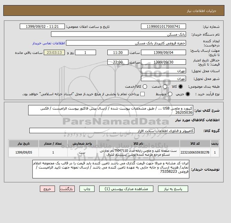 شرح کلی نیاز: کیبورد و ماوس USB ... / طبق مشخصات پیوست شده / ارسال پیش فاکتور پیوست الزامیست / فکس 26205036
