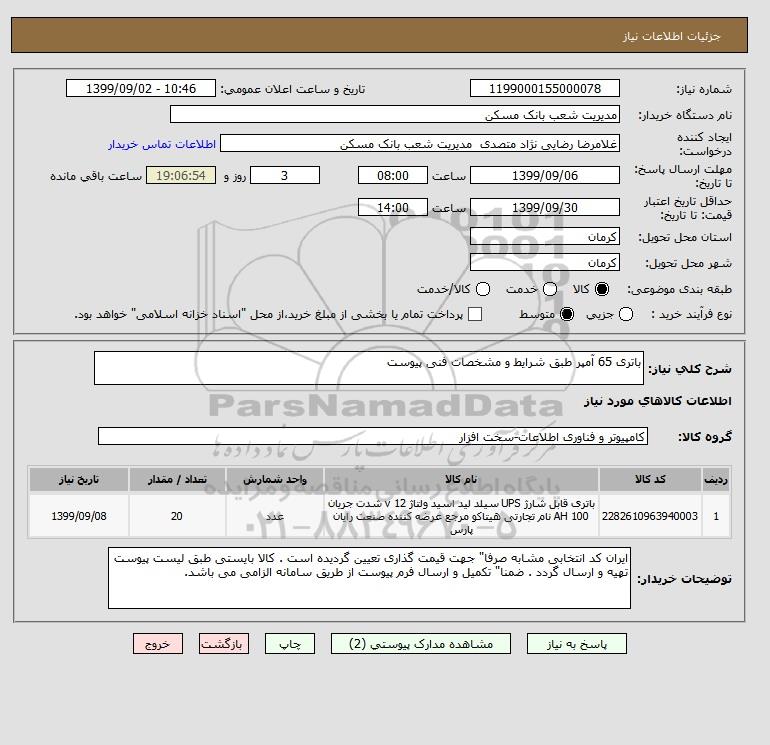 شرح کلی نیاز: باتری 65 آمپر طبق شرایط و مشخصات فنی پیوست