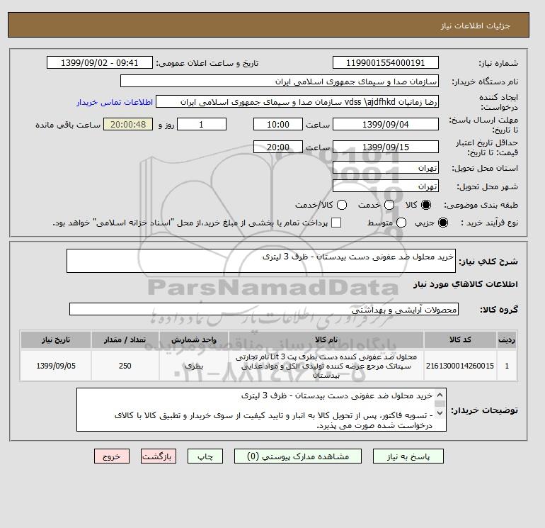 شرح کلی نیاز: خرید محلول ضد عفونی دست بیدستان - ظرف 3 لیتری
