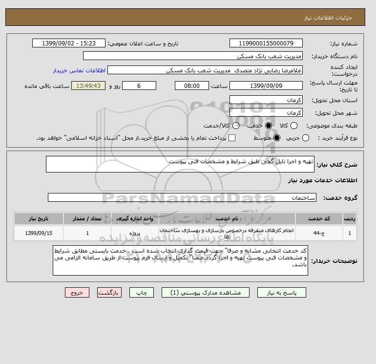 توضیحات خریدار:کد خدمت انتخابی مشابه و صرفا" جهت قیمت گذاری انتخاب شده است ، خدمت بایستی مطابق شرایط و مشخصات فنی پیوست تهیه و اجرا گردد.ضمنا" تکمیل و ارسال فرم پیوست از طریق سامانه الزامی می باشد.